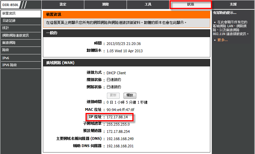 6.點選「狀態」,檢查 廣域網路WAN 是否抓到真實IP,