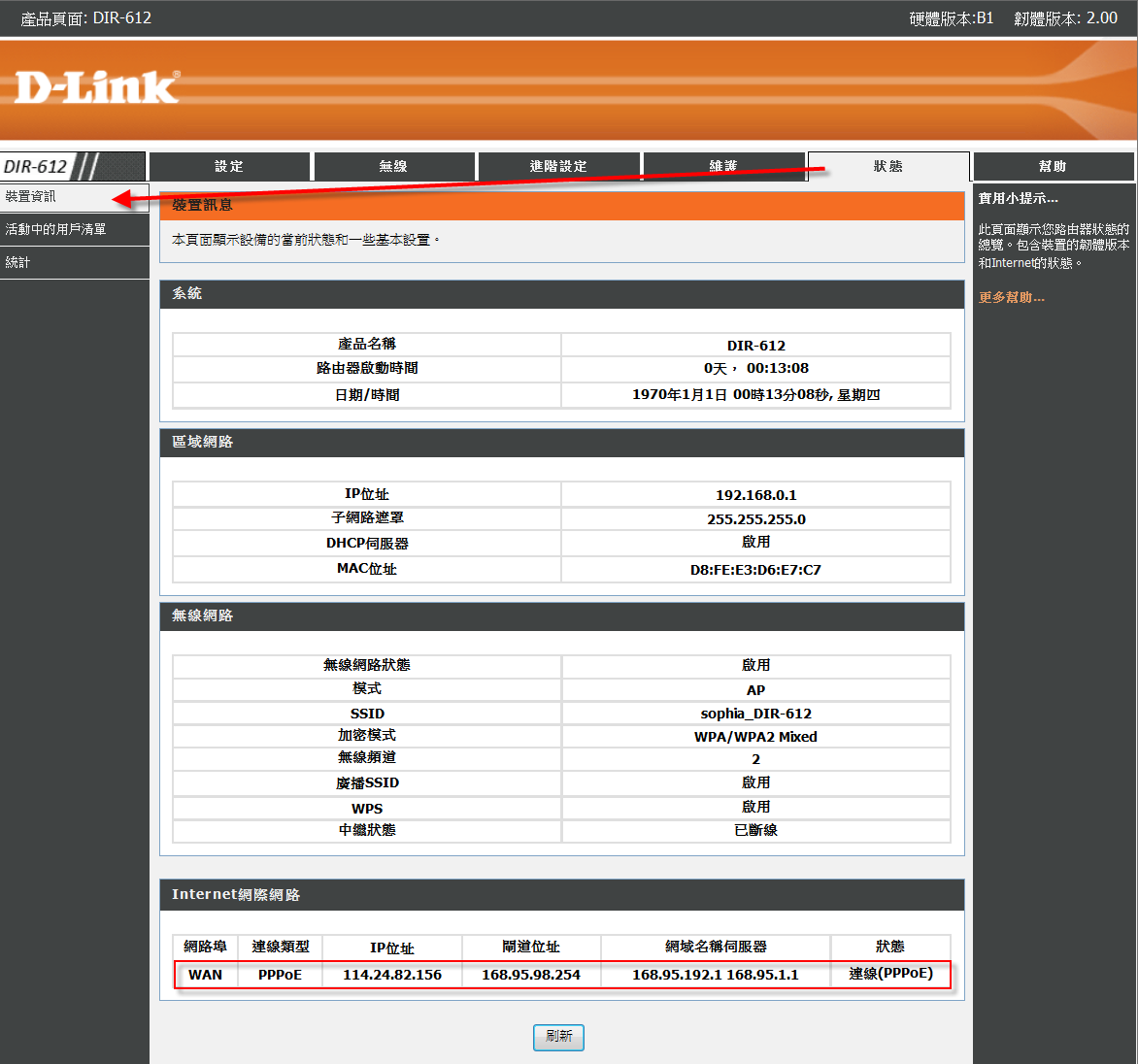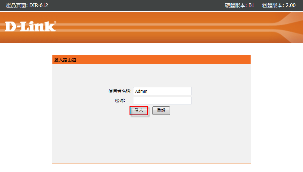 範例設備型號DIR-612 硬體版本:B1 軔體版本:2.00