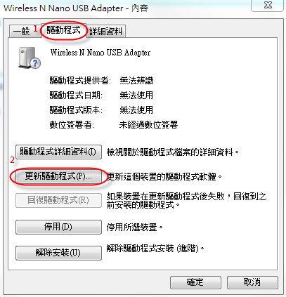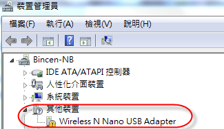 6.於其他裝置會出現未安裝的USB硬體,於WirelessN Nano USB Adapter點滑鼠二下