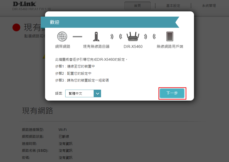 5.登入之後,稍微等一下,就會自動跳出設定精靈畫面,點選下一步。
