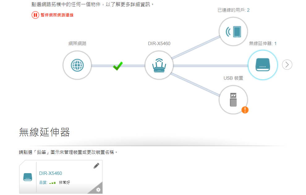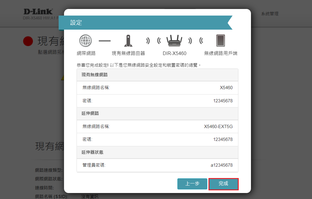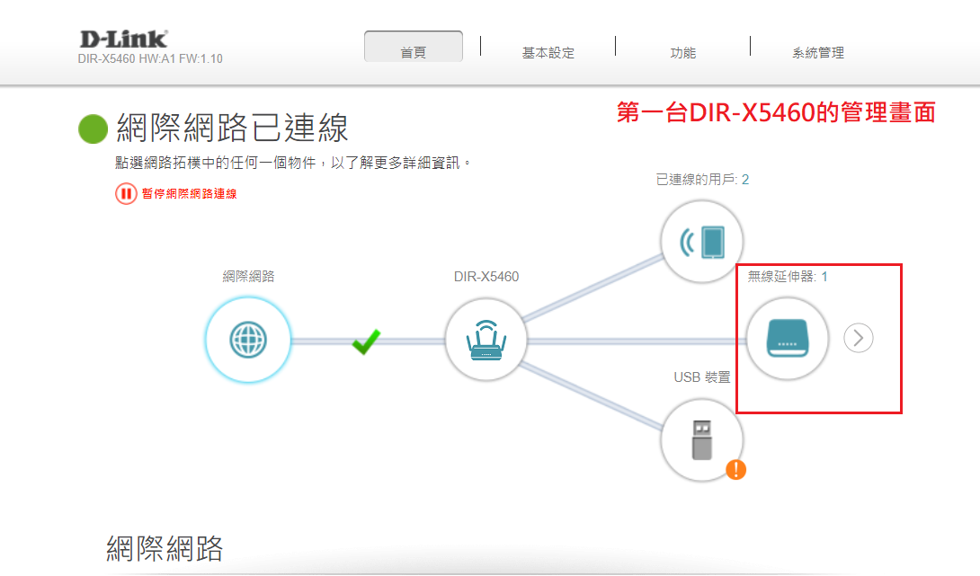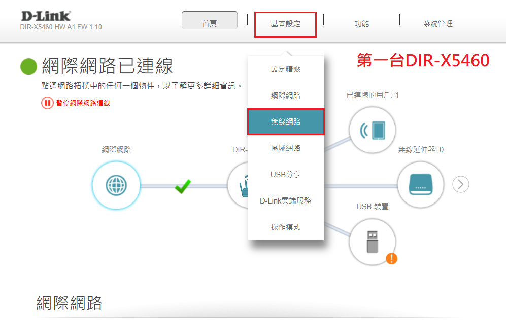 登入第一台DIR-X5460的管理畫面,無線延伸器會顯示1,代表有延伸成功第二台的DIR-X5460。