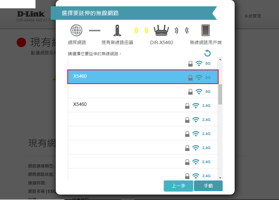7.點選第一台的DIR-X5460的5G無線名稱並輸入無線密碼,點選下一步。