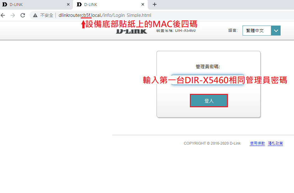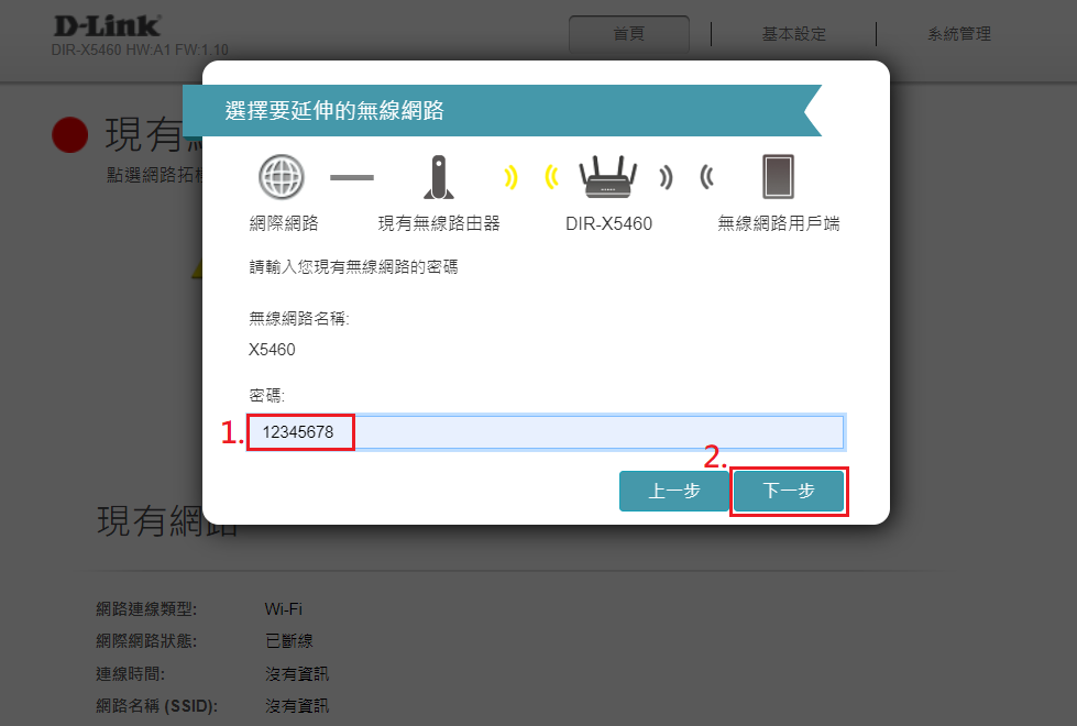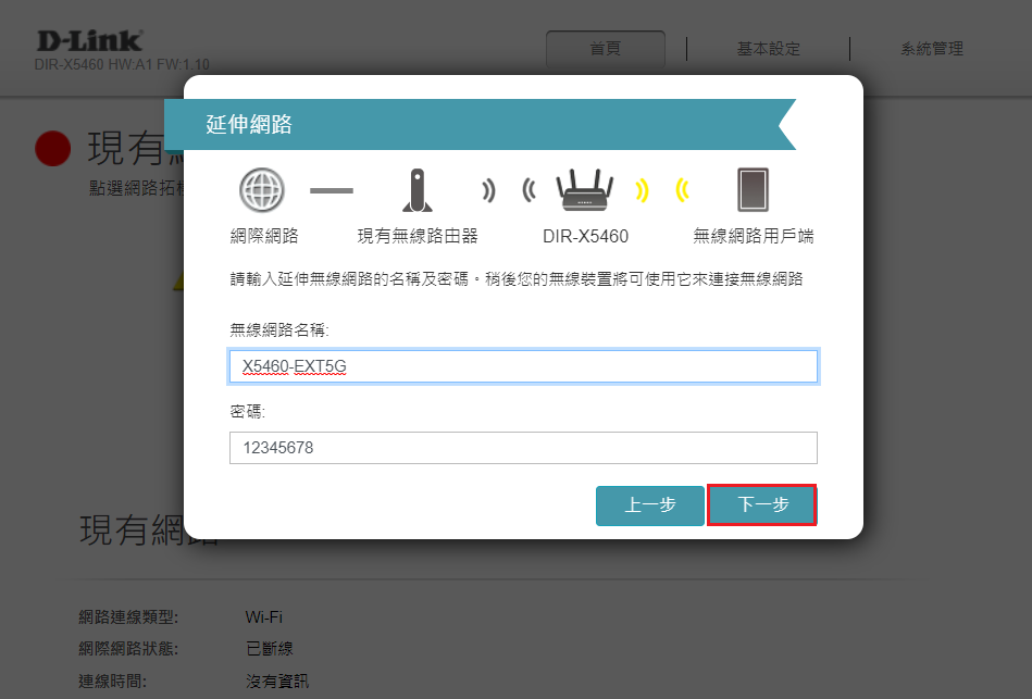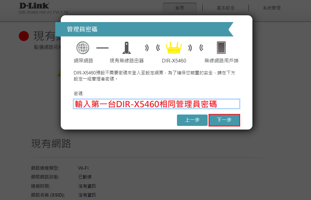 9.輸入第一台DIR-X5460的管理員密碼,點選下一步。