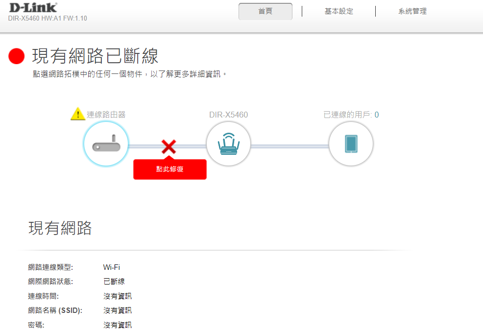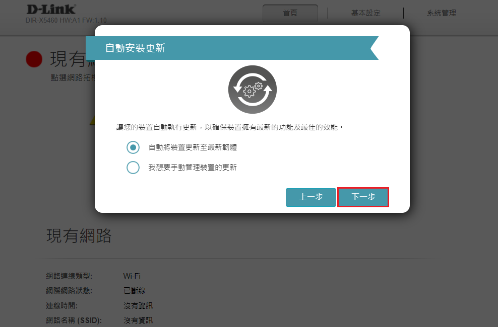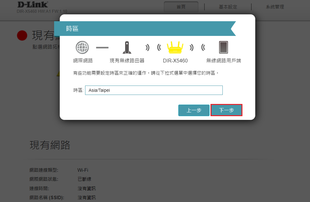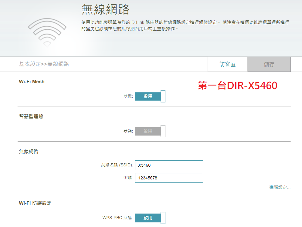 先登入第一台DIR-X5460管理員畫面,點選基本設定>無線網路,確認Wi-Fi Mesh為開啟並確認無線名稱和密碼。