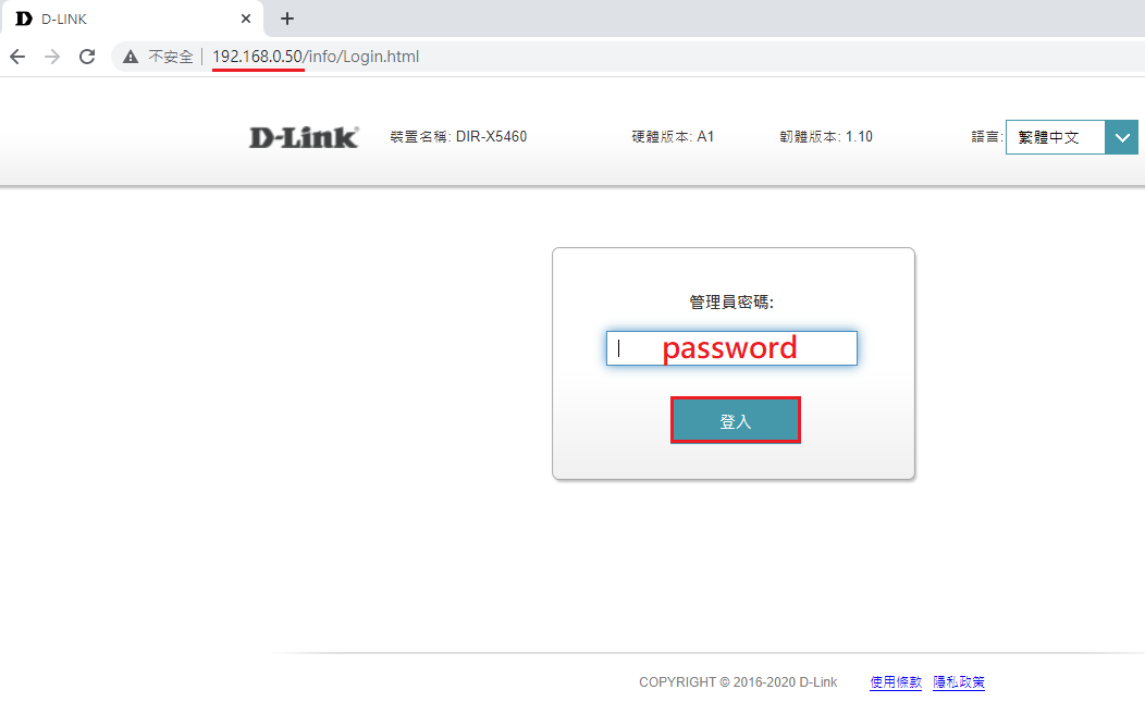 4.若沒有自動跳出登入頁面,打開網頁輸入網址192.168.0.50或http://dlinkrouterXXXX.local就可至登入管理員密碼,使用預設的管理員密碼【password】登入。