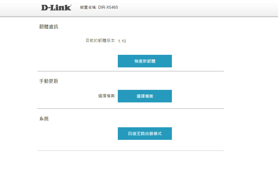 畫面只剩下檢查新韌體、手動更新韌體和回復至路由器設定(RESET)的選項。