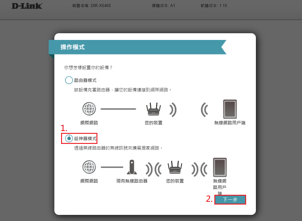3.點選 延伸器模式 > 下一步,等候倒數。