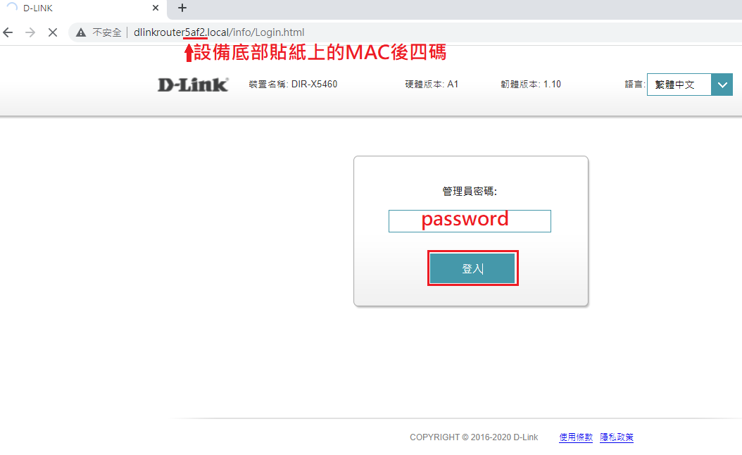 1.用電腦打開網頁輸入網址192.168.0.1或http://dlinkrouterXXXX.local就可至登入管理員密碼,使用預設的管理員密碼【password】登入。