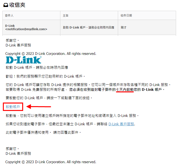 4. 登入您電子信箱中,找到「啟用Dlink帳號」郵件點內的「啟用帳戶」。
