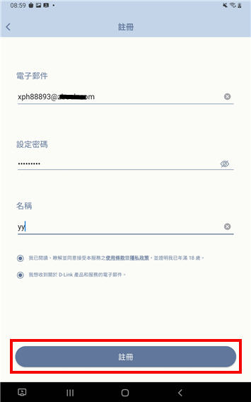 2.輸入您電子郵件à設定您的密碼(必須為6-30個字元)à點選下方同意使用條款,填寫完畢後按下方「註用」。
