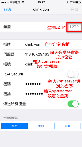 帳號/密碼/密鑰:請輸入VPN server帳號/密碼/金鑰or PSK