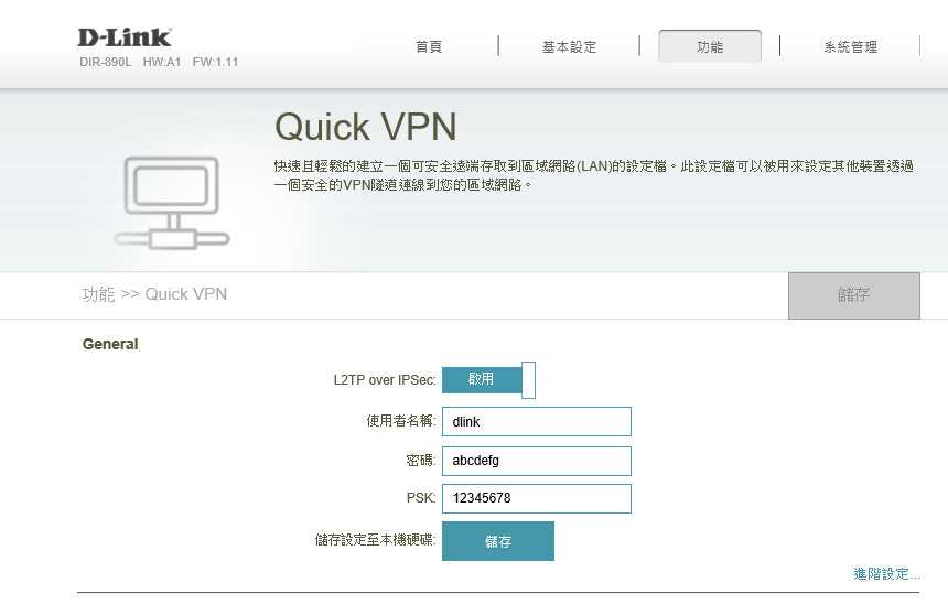 以下畫面為DIR-890L 開啟VPN功能設定頁面,設定時請依您實際的資料輸入