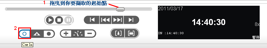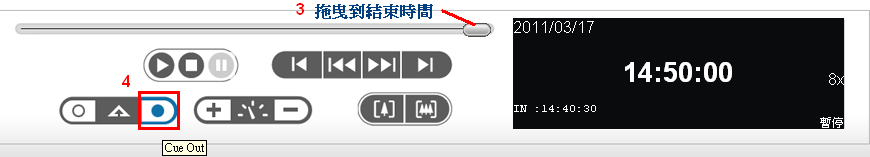 請拖曳起始時間點,並按下 (Cue in) ,之後再拖曳結束時間點,並按下 (Cue out) <見下圖>
