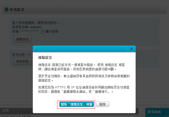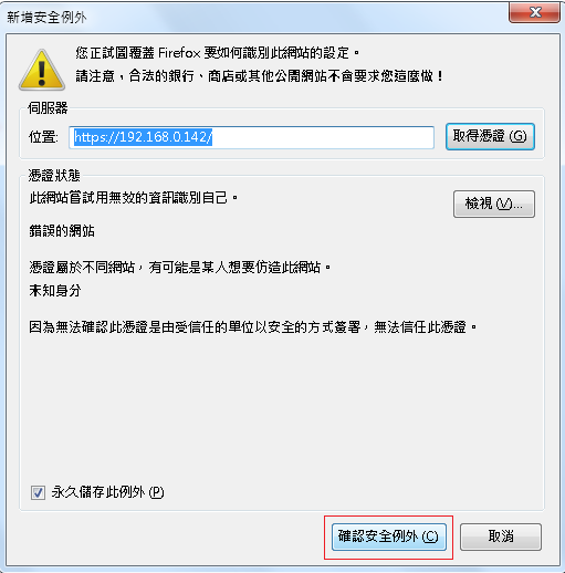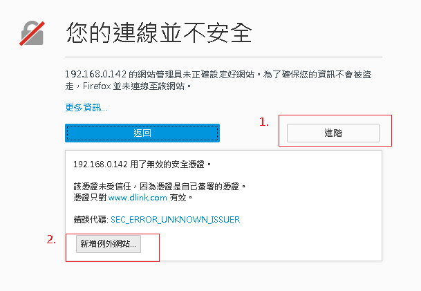 4. 點選【開啟「進階設定」視窗】後選【進階】→【新增例外網站】→【確認安全例外】