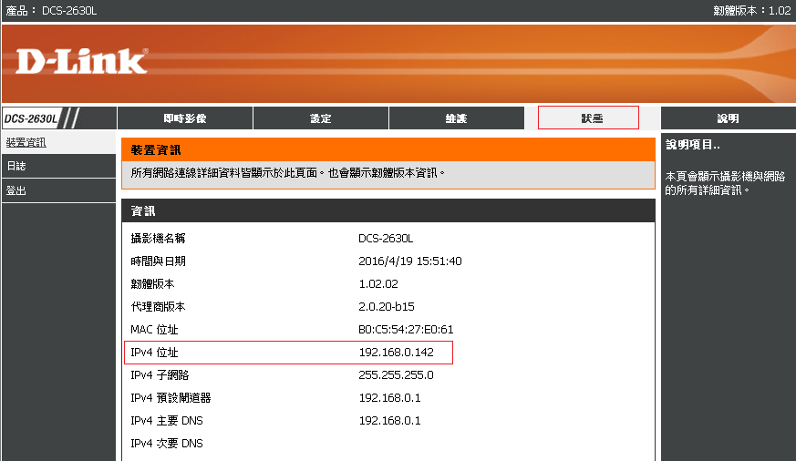 5. 開啟攝影機的設定畫面後,請點選右上方【狀態】查看中間的IPV4位址即為區網IP位址資訊。