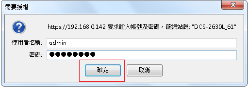 出現授權驗證畫面,使用者名稱輸入:admin、密碼(請輸入自行設定的攝影機密碼) 後按下【確定】
