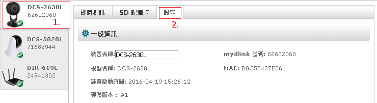 2. 點選左邊的攝影機型號→在點選畫面中間的【設定】