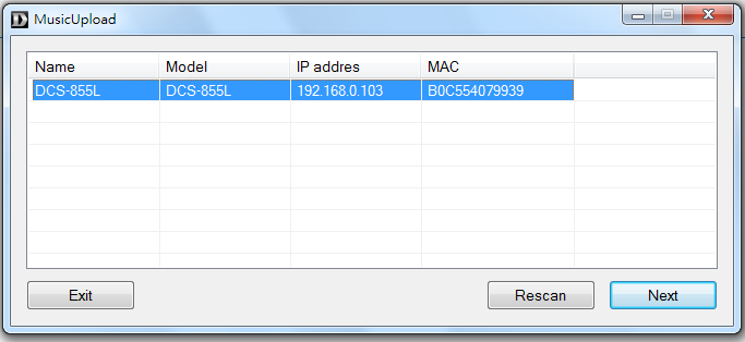 2.執行MusicUpload ,搜尋到攝影機後,直接點選攝影機後按Next。