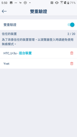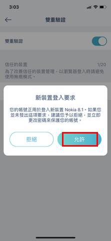 雙重驗證功能可讓第二台以上的裝置登入同一個帳號時,第一台裝置須允許其它裝置後才可登入。此方式可清楚控管哪些裝置可登入此帳號,有效達到安全控管。