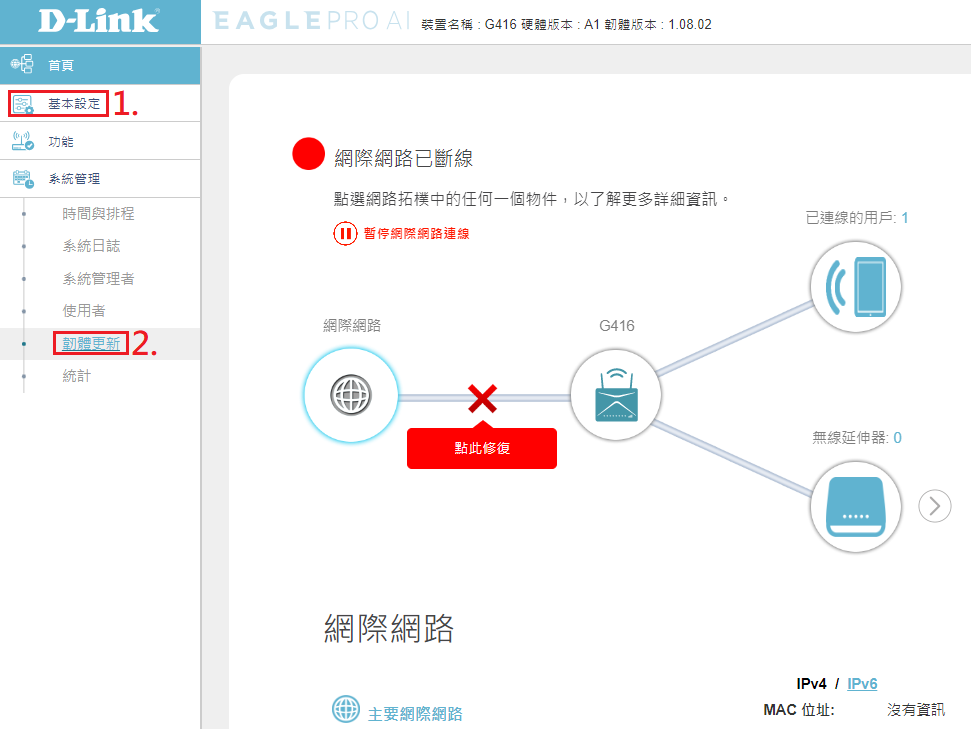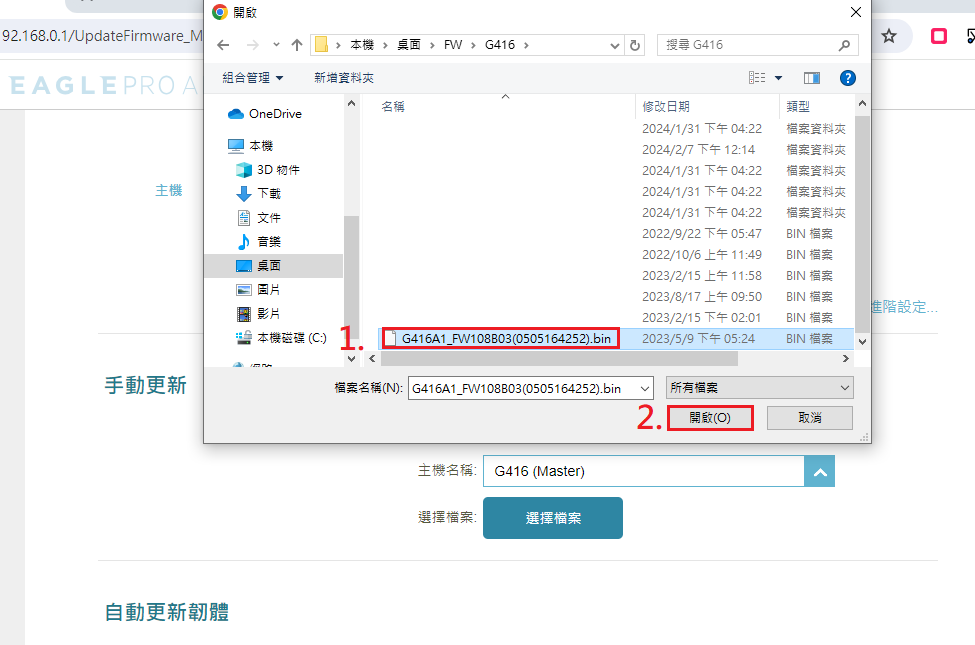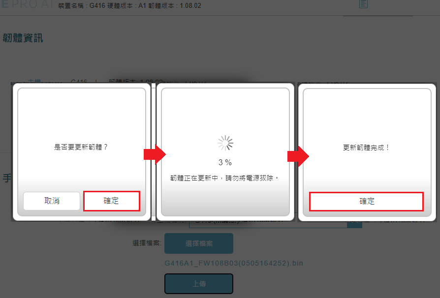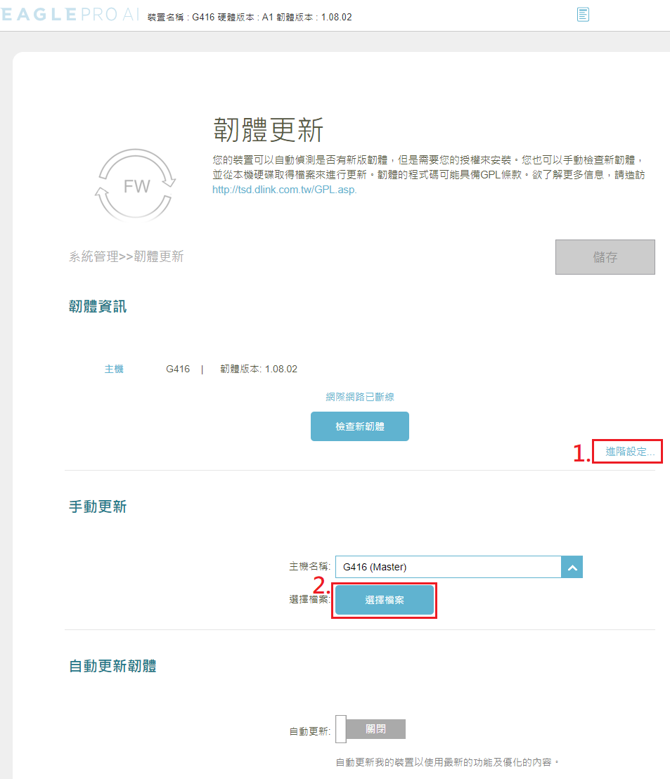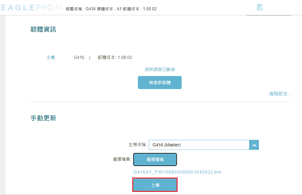 透過電腦開啟網頁登入G416的管理畫面,可在沒有對外網路連線下並手動更新韌體。