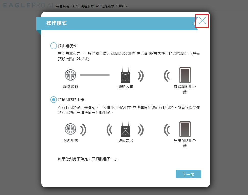 3.在操作模式頁面點選 X 跳出安裝精靈畫面。