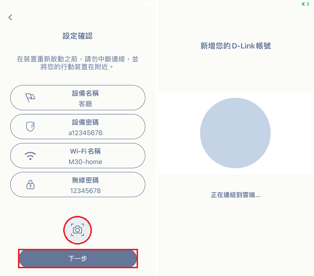 8.查看並確認設定資訊,若想留存設定值可點選截圖,確認無誤後按「下一步」即開始連結到雲端。