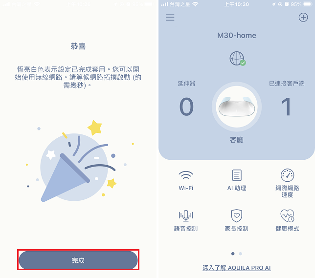 10.當畫面出現恭喜即完成設定,點選「完成」後即可於AQUILA PRO AI app中查看M30的相關狀態並進行管理。
