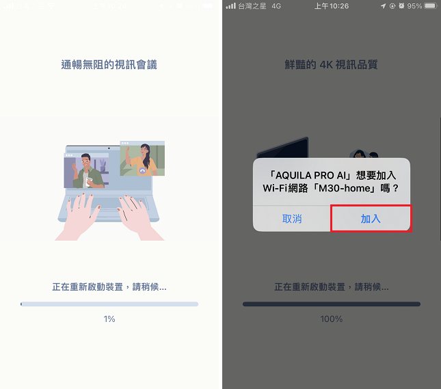 9.此時畫面會以百分比呈現進度,請稍候線條跑至100%,接著畫面出現想要加入您新設定的Wi-Fi,請點選「加入」。