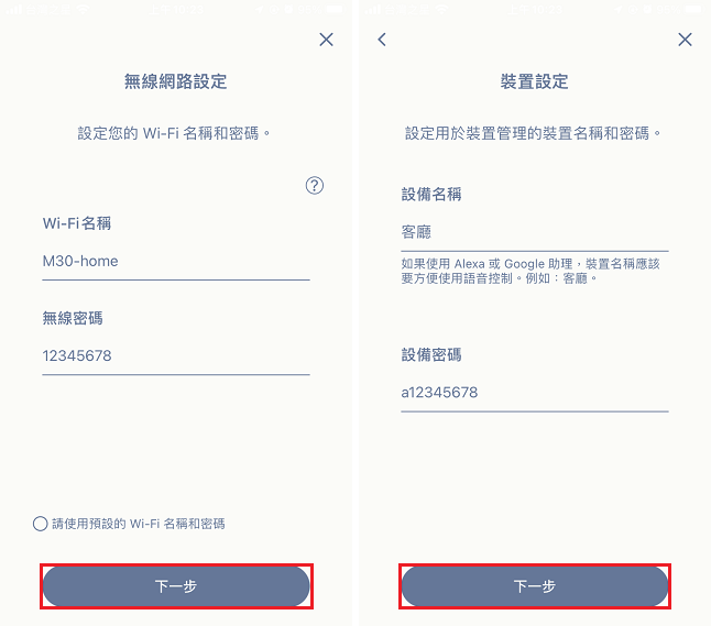 7.接著請自行設定Wi-Fi名稱與密碼「下一步」再設定設備名稱與設備密碼後「下一步」繼續。