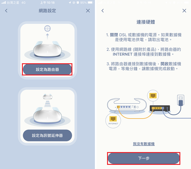 3.接著點選「設定為路由器」並確認數據機已開機且連接到M30的INTERNET孔後按「下一步」繼續。