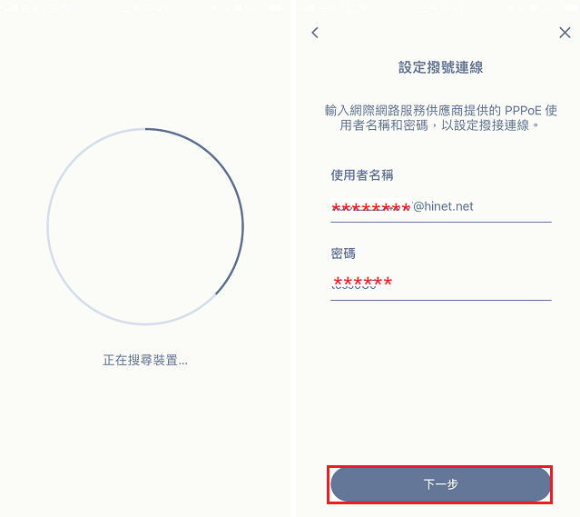6.此時即開始偵測來源,若您的業者需帳號密碼(例如中華電信),此時畫面會出現設定撥號連線的欄位,請輸入業者提供的帳密後按「下一步」;若您的業者無須帳密(例如凱擘大寬頻),則畫面會直接跳至下一步驟。