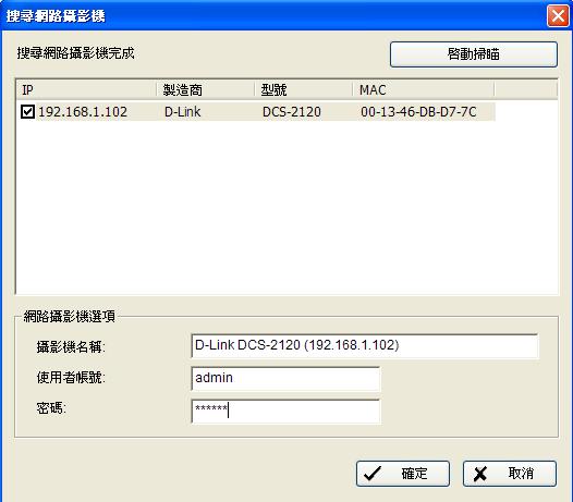 6、在下方清單內會顯示搜尋到的攝影機,勾選並點選您要新增的攝影機,在下方「攝影機名稱」欄位內可更改為您想要給此攝影機的名稱,若此攝影機有設定帳號密碼,請在下方「使用者帳號」和「密碼」欄位內輸入相同的資料à按下「確定」