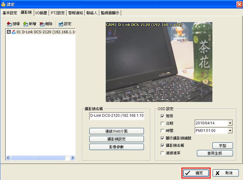 7、在預覽攝影機視窗內會出現攝影機畫面,另可依您的需求在右下方OSD設定更改預設設定,按下「確定」