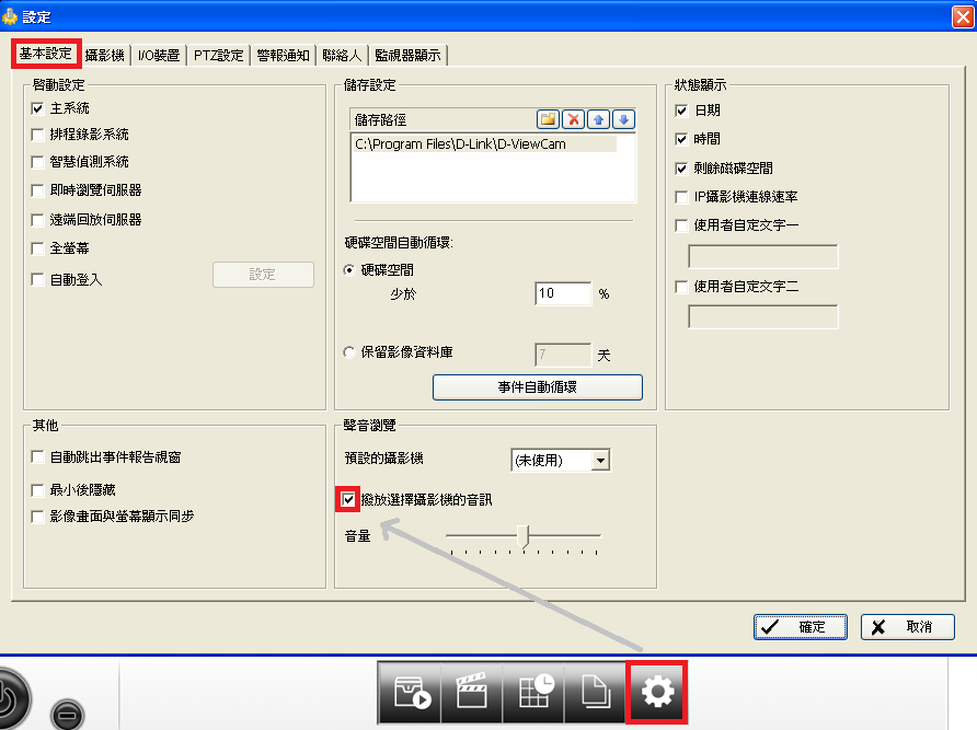 若您撥放影片時要聽取聲音 , 請至 "設定" (齒輪符號) 中 , 勾選 「撥放選擇攝影機的音訊 」 , 並調整其音量大小
