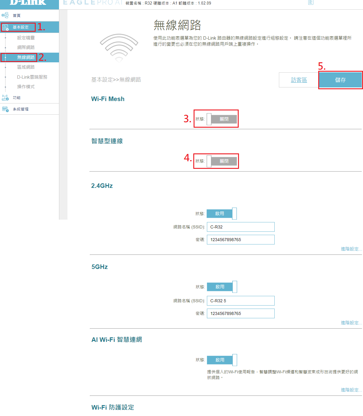 2.點選 基本設定>無線網路,關閉Wi-FiMesh即可關閉智慧連線,針對2.4GHz或5GHz變更不同的網路名稱。