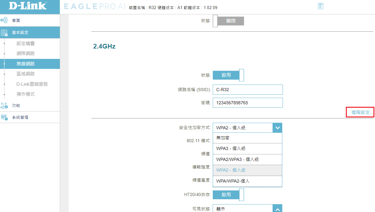 分別在2.4GHz或5GHz點選進階設定即可變更安全性加密方式,2.4GHz和5GHz無線加密預設為WPA2-個人級。