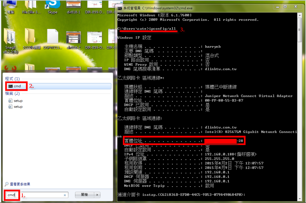 備註:於電腦開始鍵的「搜尋程式及檔案」打上「cmd」→打上「ipconfig/all」→於實體位址查看此台電腦Mac