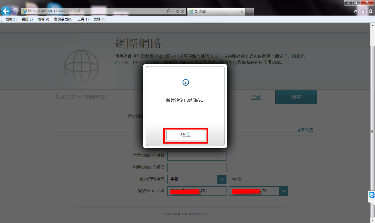 *ADSL申辦速率為8M以上或光纖者,請點選「進階設定」的MTU值(封包傳送單位):建議改為1445