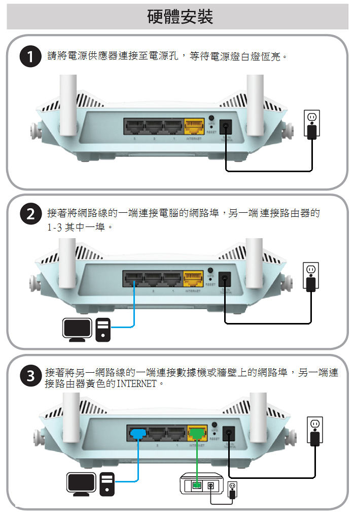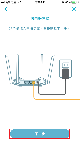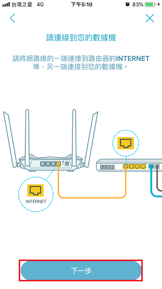 4.確認數據機開機後點選「下一步」,並確認數據機已連接到路由器INTERNET孔繼續「下一步」。
