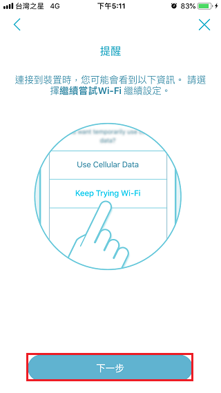 6.確認電源燈白燈恆亮「下一步」,提醒後續步驟若手機出現畫面訊息請選擇繼續嘗試Wi-Fi,了解後點「下一步」繼續。