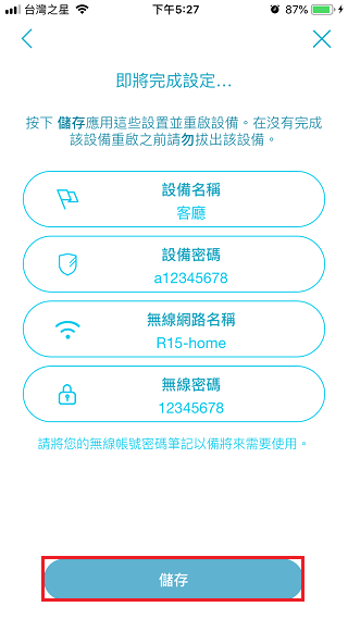 10.為您設備取個裝置名稱後「下一步」,查看並確認相關設定資訊無誤後按「儲存」。