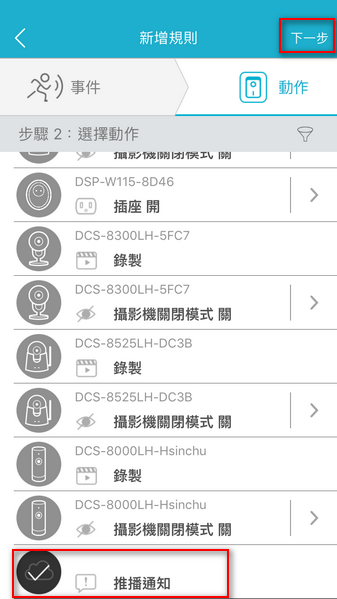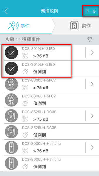 6.選擇移動及聲音偵測二種條件進行觸發→『下一步』