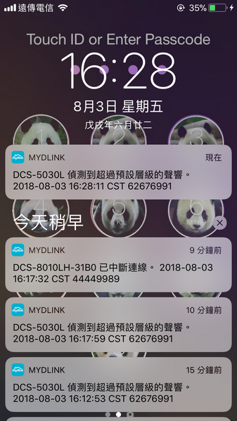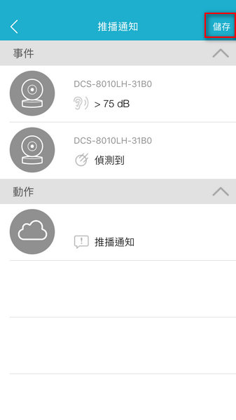 說明:推播通知功能為MYDLINK APP發送提醒訊息至您的手機,針對攝影機或其它雲端設備設定觸發移動或聲音偵測發送通知,開啟此功能所有登入MYDLINK帳號手持裝置皆會收到通知,若有單一手持裝置無需接收,須於此台手持裝置中之推播通知設定停止接收。一旦於MYDLINK APP中將推播通知關閉,所有登入之MYDLINK帳號之設備皆無法收到通知。
