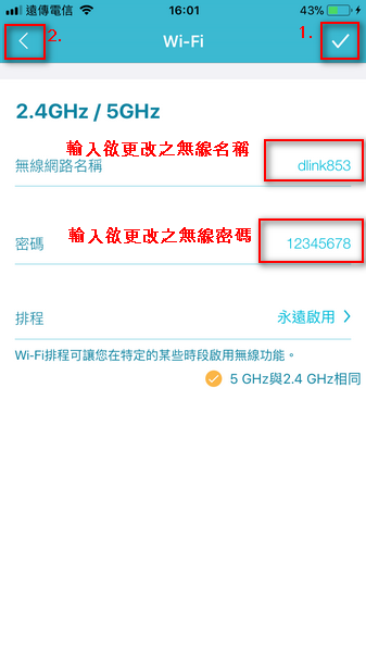 5.請輸入欲設定之無線網路名稱及密碼→點選『V』→『<』