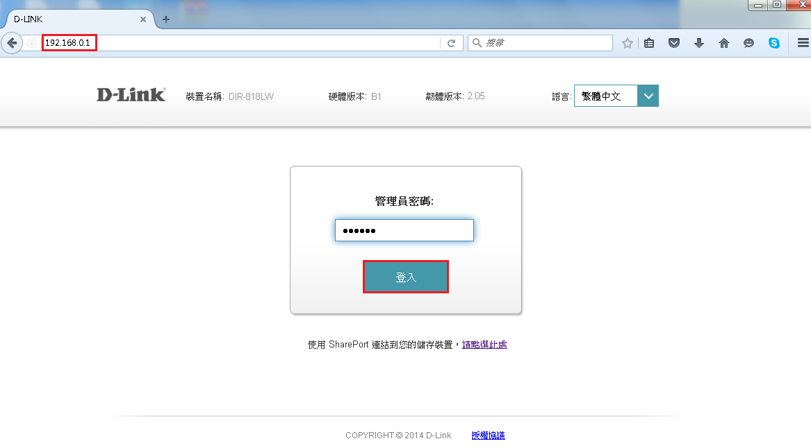 1. 請開啓電腦的網際網路瀏覽器,並於網址輸入「192.168.0.1」進入路由器設定頁面,輸入管理員密碼後按登入。