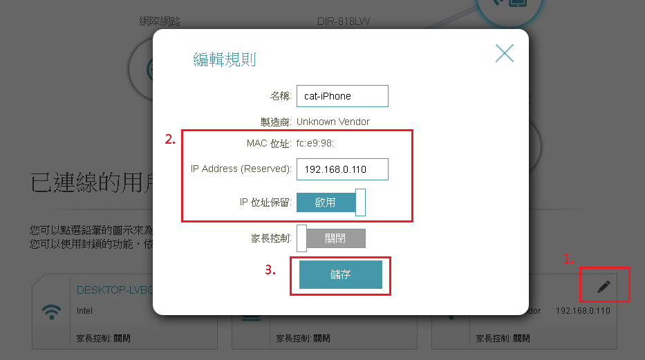 於編輯規則內將該IP位址保留功能「啟用」後按下「儲存」。