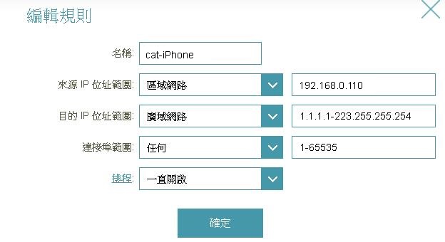 來源IP位址範圍:選擇「區域網路」 後方輸入區網IP位址可使用範圍設定 如192.168.0.100-192.168.0.110或是單一的設備IP位址
